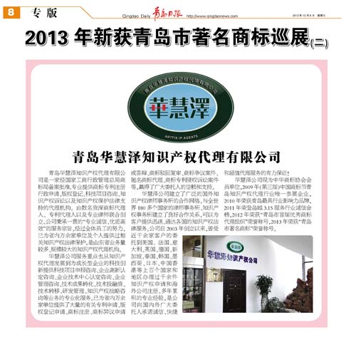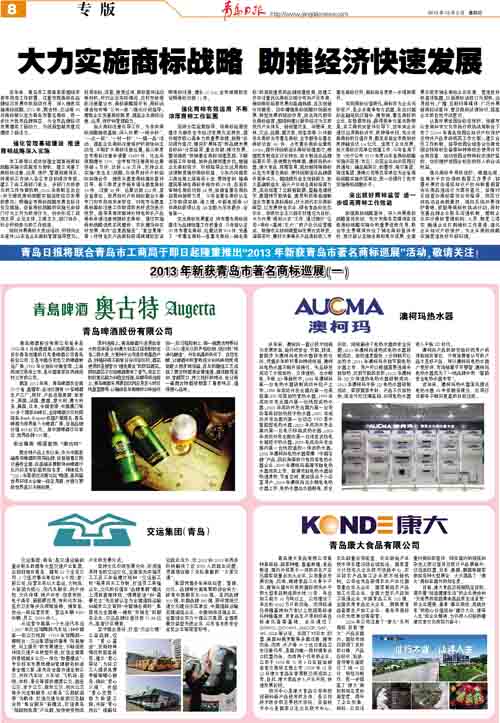 近年來,青島市工商局緊緊圍繞市委市政府工作部署,注重發(fā)揮商標在品牌經(jīng)濟發(fā)展中的驅動作用,深入推進實施商標戰(zhàn)略,2013年,奧古特、交運等90件商標被認定為青島市著名商標,進一步壯大我市品牌陣容,為全市品牌經(jīng)濟發(fā)展增添了新動力,為創(chuàng)新型城市建設增添了新活力