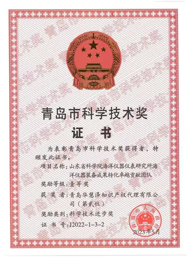 近日,青島市政府公布了《關(guān)于2022年度青島市科學(xué)技術(shù)獎勵的決定》(青政發(fā)〔2023〕8號)。青島華慧澤知識產(chǎn)權(quán)代理有限公司與山東省科學(xué)院海洋儀器儀表研究所等單位合作的“海洋儀器裝備成果轉(zhuǎn)化卓越貢獻(xiàn)團(tuán)隊(duì)”項(xiàng)目,榮獲“2022年度青島市科學(xué)技術(shù)進(jìn)步獎一等獎”,是行業(yè)僅有上榜企業(yè)。這一榮譽(yù)再次彰顯了華慧澤公司在海洋儀器裝備成果轉(zhuǎn)化領(lǐng)域發(fā)揮專業(yè)優(yōu)勢,務(wù)實(shí)推進(jìn)行業(yè)發(fā)展做出的突出貢獻(xiàn)。