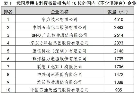 在專利方面:2019年,我國(guó)發(fā)明專利申請(qǐng)量為140.1萬(wàn)件。共授權(quán)發(fā)明專利45.3萬(wàn)件。其中,國(guó)內(nèi)發(fā)明專利授權(quán)36.1萬(wàn)件。在國(guó)內(nèi)發(fā)明專利授權(quán)中,職務(wù)發(fā)明為34.4萬(wàn)件,占95.4%。2019年,我國(guó)發(fā)明專利授權(quán)量排名前3位的國(guó)內(nèi)(不含港澳臺(tái))企業(yè)依次為:華為技術(shù)有限公司(4510件)、中國(guó)石油化工股份有限公司(2883件)、OPPO廣東移動(dòng)通信有限公司(2614件)。