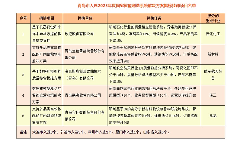 近日,工業(yè)和信息化部公示2023年度智能制造系統(tǒng)解決方案揭榜掛帥項目,全國共162個項目入選,我市軟控股份有限公司、海克斯康制造智能技術(shù)(青島)有限公司、青島寶佳智能裝備股份有限公司、青島鵬海軟件有限公司等4家企業(yè)的5個項目進(jìn)入公示名單(寶佳智能入選2個揭榜項目),入選數(shù)量居計劃單列市首位,全省第一。