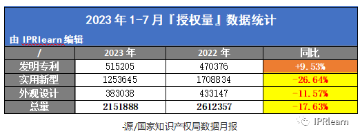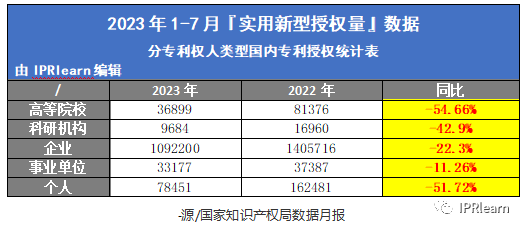 根據(jù)國知局公布的月報(分專利權(quán)人類型國內(nèi)專利授權(quán)統(tǒng)計表)2023年1月-7月實用新型授權(quán)量與去年同比: