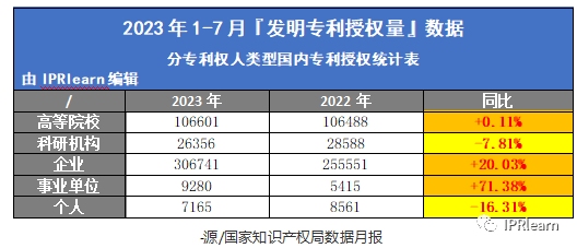 根據(jù)國知局公布的月報(分專利權(quán)人類型國內(nèi)專利授權(quán)統(tǒng)計表)2023年1月-7月發(fā)明專利授權(quán)量與去年同比: