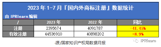 2023年1月-7月共注冊商標(biāo)2395674件,同比下降41.45%。截至目前,我國有效注冊商標(biāo)量達(dá)4089.8萬件,同比增長8.9%。