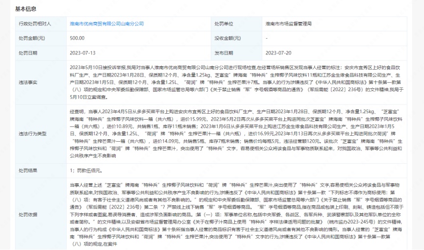 2023年5月10日接投訴舉報,我局對當事人準南市優尚商貿有限公司山南分公司進行現場檢查,在經營場所銷售區發現當事人經營的標注:安慶市宜秀區上好的食品飲料廠生產、生產日期2023年1月28日、保質期12個月、凈含量1,25kg、“芝富寶”牌海南“特種兵”生椰子風味飲料11瓶和江蘇金生緣食品科技有限公司生產生產日期2023年1月5日、保質期12個月、凈含量1.25L"荷潤”牌“特種兵”生榨芒果7瓶。當事人的行為涉違反了《中華人民共和國商標法》第十條第一款第(項的規定和中央軍委后勤保部,國家市場監管總局等六部門《關于禁止銷售“軍”字號煙酒等商品的通告》(軍后需能2022) 236號) 的文件精神,我局5月10日立案調查
