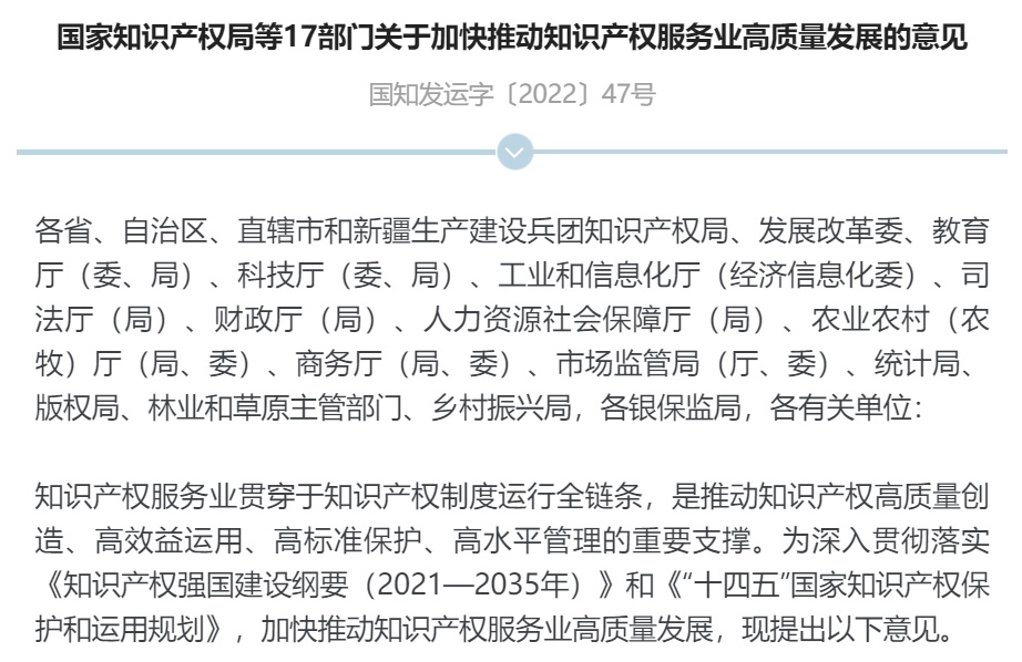 最近國(guó)知局發(fā)布了《17部門(mén)關(guān)于推動(dòng)知識(shí)產(chǎn)權(quán)服務(wù)業(yè)高質(zhì)量發(fā)展的意見(jiàn)》,意見(jiàn)涉及到的內(nèi)容很全面,考慮到知識(shí)產(chǎn)權(quán)服務(wù)業(yè)的方方面面。這些意見(jiàn)都是提綱挈領(lǐng),站在比較宏觀的層面。