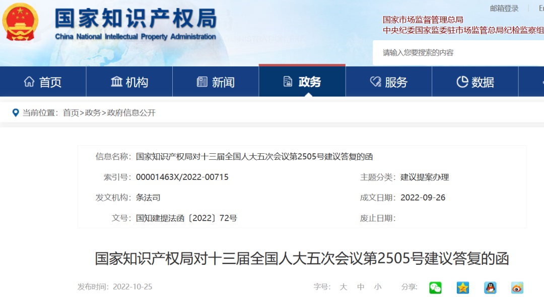 國家知識產權局對十三屆全國人大五次會議第2505號建議答復的函