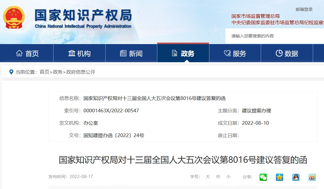 國家知識產(chǎn)權(quán)局對十三屆全國人大五次會議第8016號建議答復(fù)的函