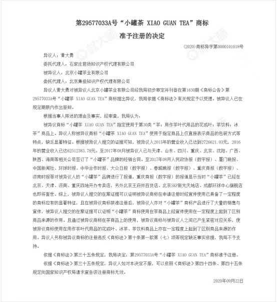 事實也正是如此,北京小罐茶業有限公司創立于2014年,創立初便嘗試申請注冊了以“小罐茶”為名的商標,但也確實因為注冊產品類別缺乏顯著性而被駁回,然后便開始了無休止的駁回復審,期間北京小罐茶業有限公司也是確實將產品放在第一位,用心做好茶,并且也是收獲一致好評和媒體宣傳報道,一直持續到2018年重新提交注冊并且再次進入駁回復審階段,通過提供公司經營創收產生的影響力,與多地多家公司簽訂合作合同,具有一定程度的大眾辨識度,加上媒體報道等相關證據,終于在2020年九月份,商標局正式準予注冊!