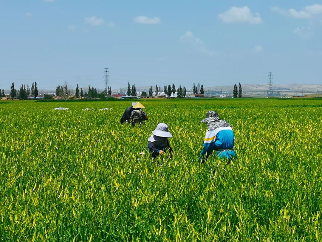 盛夏的七月,走進寧夏吳忠市鹽池縣惠安堡鎮大壩村,金燦燦的朵朵黃花鑲嵌在綠葉間格外耀眼,一個個忙碌的身影穿梭在基地里,正在作業采摘的就是葉片細長發散的植物——黃花菜。
