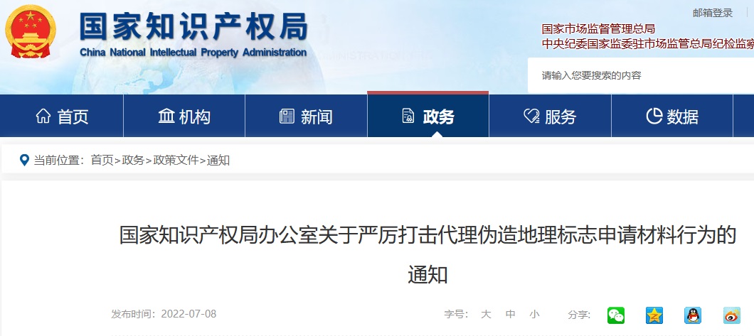 國家知識產權局辦公室關于嚴厲打擊代理偽造地理標志申請材料行為的通知