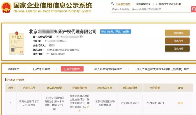 近日,國家企業信用信息公示系統發布了一則行政處罰信息。北京一知識產權代理有限公司在商標局官網未曾下發正式駁回通知的情況下就通知申請人其申請商標被駁回,涉嫌以不正當手段擾亂商標代理市場秩序。北京市海淀區市場監督管理局現責令該公司改正違法行為,并決定處罰如下:警告;罰款:20000元。此前,IPRdaily曾發布《自稱直屬國知局,能夠提前預測商標被駁回?》一文。