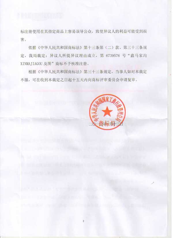 “鑫馬家溝xinmajiagou及圖”商標異議裁定書