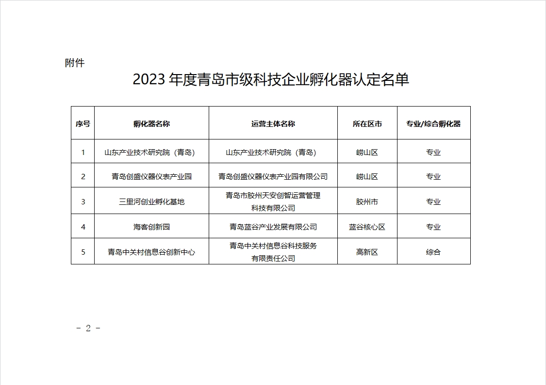 附件:2023年度青島市級科技企業孵化器認定名單