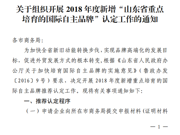 相關下載:關于組織開展2018年度新增“山東省重點培育的國際自主品牌”認定工作的通知.pdf