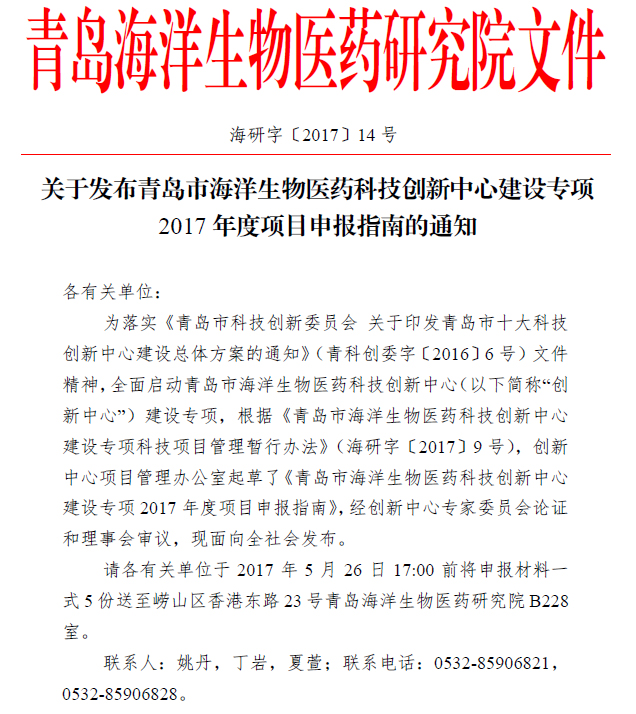 海研字 2017 14號 關于發布青島市海洋生物醫藥科技創新中心建設專項2017年度項目申報指南的通知.pdf
